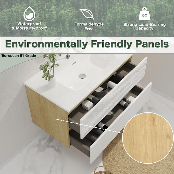 36 in. Wall-Mounted Floating Bath Vanity in Natural Oak and White with Single Ceramic Sink Top in White