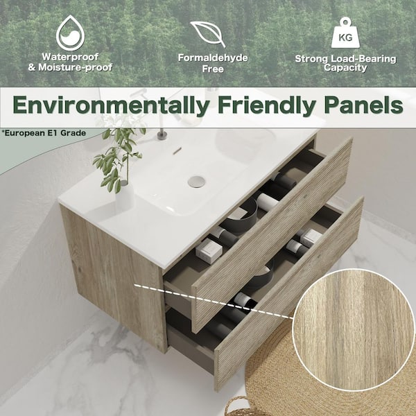 36 in. Wall-Mounted Floating Bath Vanity in Rough Oak with Single Ceramic Sink Top in White