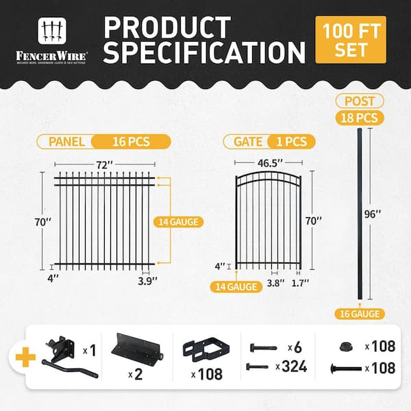6 ft. x 6 ft. Heavy-Duty Spaced Bar Pinnacle Flat Metal Fence Panel with Arched Fence Gate(Set of 100 ft. )