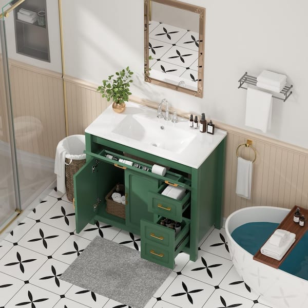 36 in. Single Sink Freestanding Green Bath Vanity with White Ceramic Top Unassembled