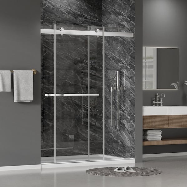 60 in. W x 75 in. H Double Sliding Frameless Shower Door in Brushed Nickel with Tempered Glass, Soft-closing