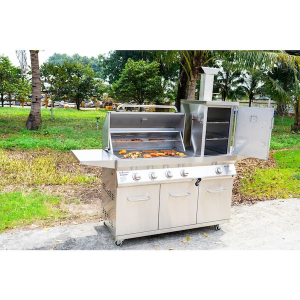 4-Burner Propane Gas Grill and Smoker with Adjustable Height Grates, Stainless Steel