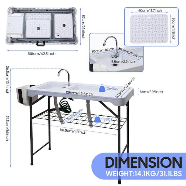 Fish Cleaning Table, Fish Cleaning Table w/ Sink Camping Table 42.5 in Camping Table w/ Dual Universal Faucet and Spray