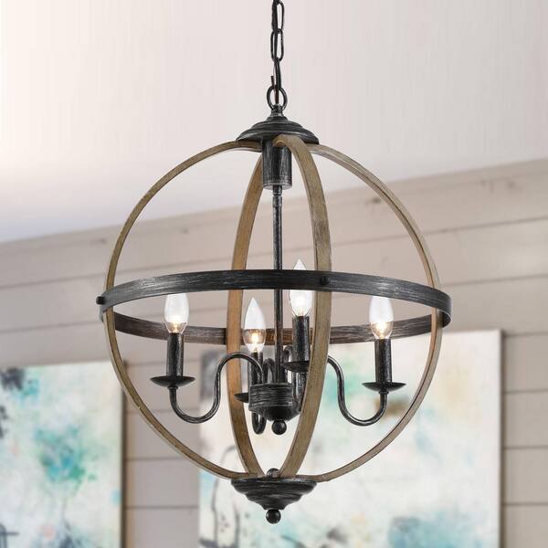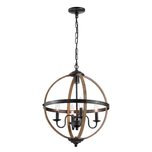 4-Light Distressed Black Candle Style Globe Chandelier with Brushed Wood Finish Accents