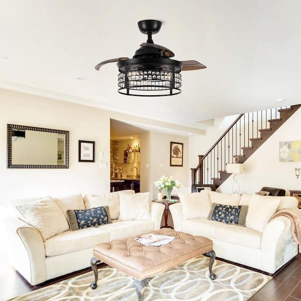 Modern 36 in. Indoor Black Retractable 3-Blade Crystal Ceiling Fan with Light Kit and Remote Control