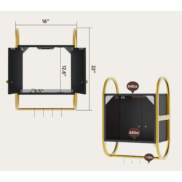 Floating Shelves 9.5in D x 16in W x 22in H, Black Wall Cabinet with 2 Door and Towel Rack Decorative Wall Shelf