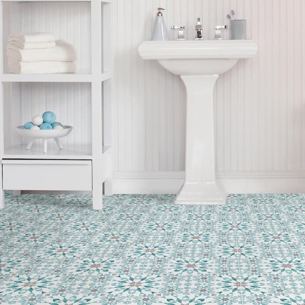 Aqua and grey vinyl floor tile with a kaleidoscope design