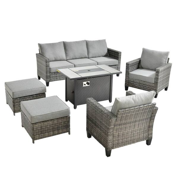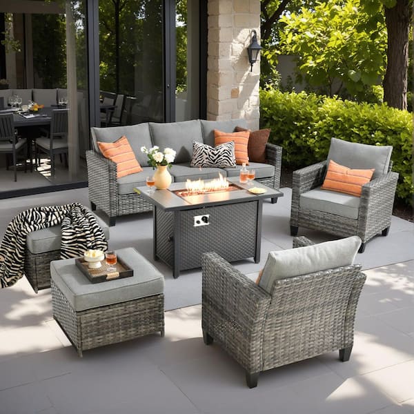Flora 6-Piece Wicker Patio Rectangle Fire Pit Conversation Set with Dark Gray Cushions