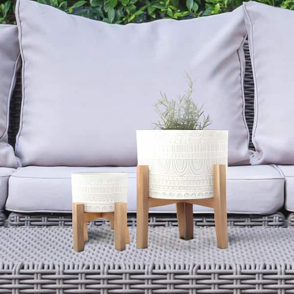 10 in. and 8 in. Ivory White Aqueduct Ceramic Plant Pot on Wood Stand Mid Century Planter (Set of 2)