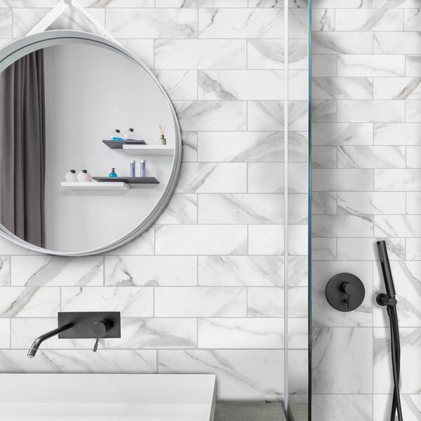 • Matte white marble look porcelain tile with a classic style