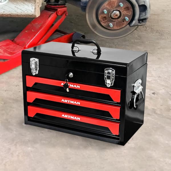 20 in. Portable 3 Drawer Steel Tool Box with Metal Latch Closure, Black and Red