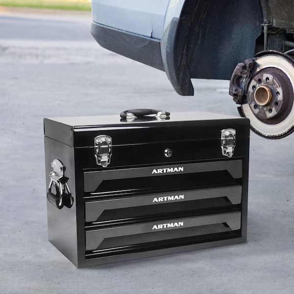 20 in Portable 3-Drawer Steel Toolbox, 4-Layers of Tools with Metal Latches, Home, or Workbench in Black