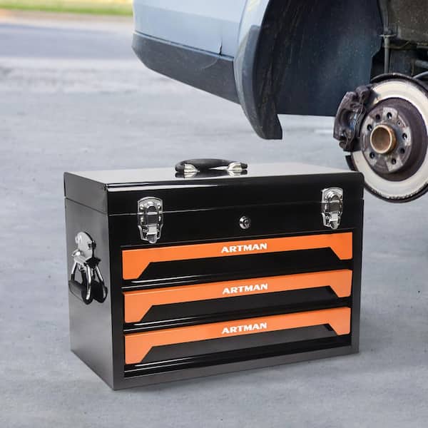 20 in Portable 3-Drawer Steel Toolbox, 4 Layers of Tools with Metal Latches, Home, or Workbench in Orange