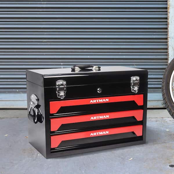 20 in Portable 3-Drawer Steel Toolbox, 4 Layers of Tools with Metal Latches, Home, or Workbench in Red