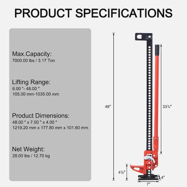 48 in. Farm Jack, 7000 lbs. Capacity Ratchet Off-Road Jack for Tractors, Trucks, SUVs, Bumper Lifts, Red