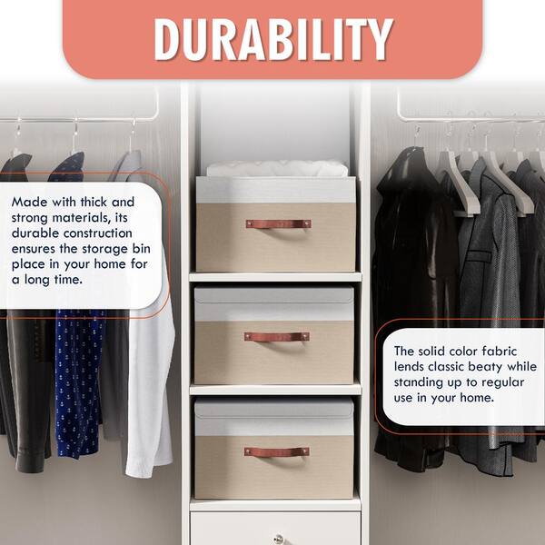 Foldable Large Storage Cube Bins Linen Fabric Shelf Basket with Leather Handles and Lid - (Set of 3)