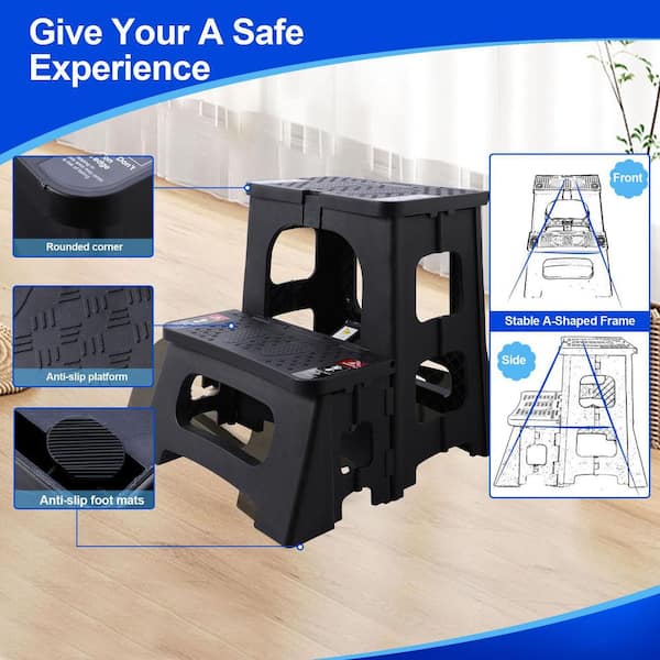 Folding 2-Step Stool Upgraded A-Frame Stability Safety Lock Anti-Slip Feet 300 lb. Capacity 8-17 Collapsible Step Stools