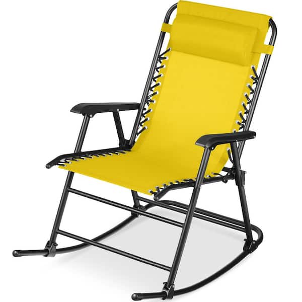 Folding Rocking Steel Outdoor Lounge Chair in Sunflower Yellow with Headrest Pillow