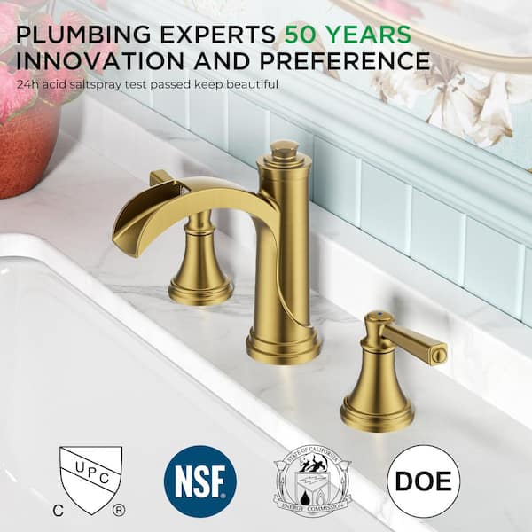 8 in. Widespread Double Handle Mid-Arc Bathroom Faucet with Metal Pop-up Drain in Brushed Gold