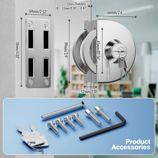 Frameless Double-Sided Sliding Glass Door Lock Polished Chrome 304 Stainless Steel for 3/8-1/2 Glass with 3 Keys