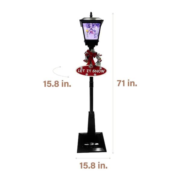 Let It Snow Series 71 in. Musical Street Lamp in Black with Snowman Scene, 2 Signs, Cascading Snow and Christmas Carols