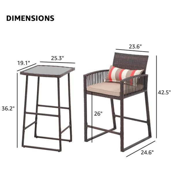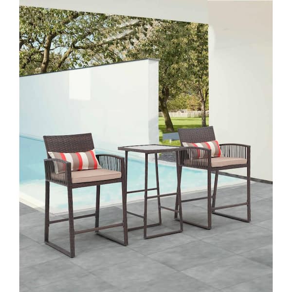 3-Piece Wicker Brown Outdoor Serving Bar Set with Beige Cushions