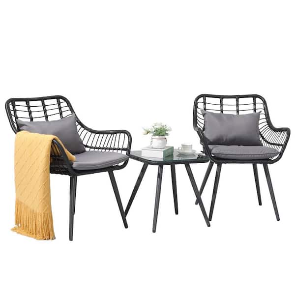 3-Piece Wicker Grey Outdoor Bistro Set Patio Conversation Set with Grey Cushions, Tempered Glass Side Table