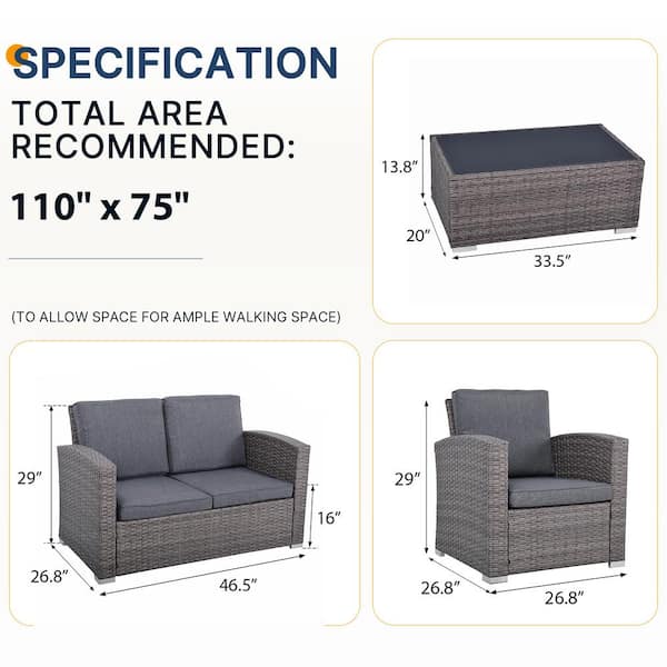 4-Piece Grey Wicker Outdoor Conversation Set with Coffee Table, Dark Grey Cushions