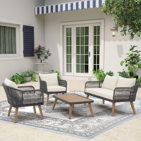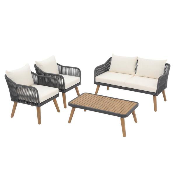 4 Piece Grey Woven Rope Outdoor Conversation Set with Wood-Top Coffee Table, Beige Cushions