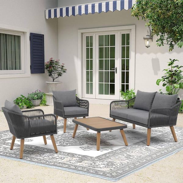 4 Piece Grey Woven Rope Outdoor Conversation Set with Wood-Top Coffee Table, Grey Cushions