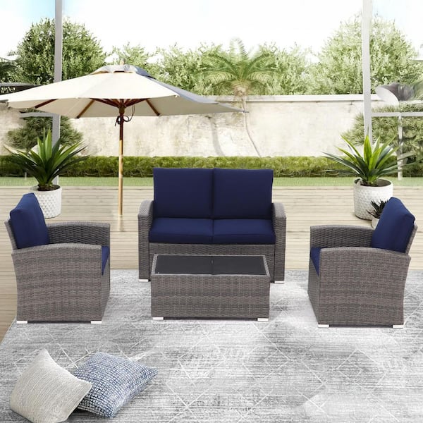 4-Piece Wicker Grey Outdoor Patio Conversation Set with Tempered-Glass Coffee Table, Navy Blue Cushion
