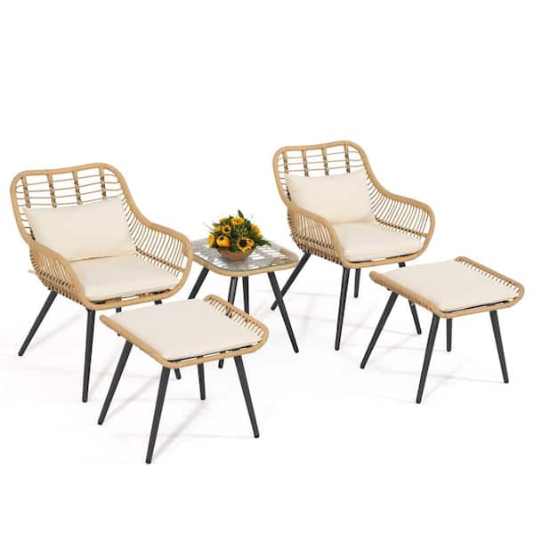 5-Piece Beige Wicker Outdoor Conversation Set with Ottomans and Square Side Table, Beige Cushions