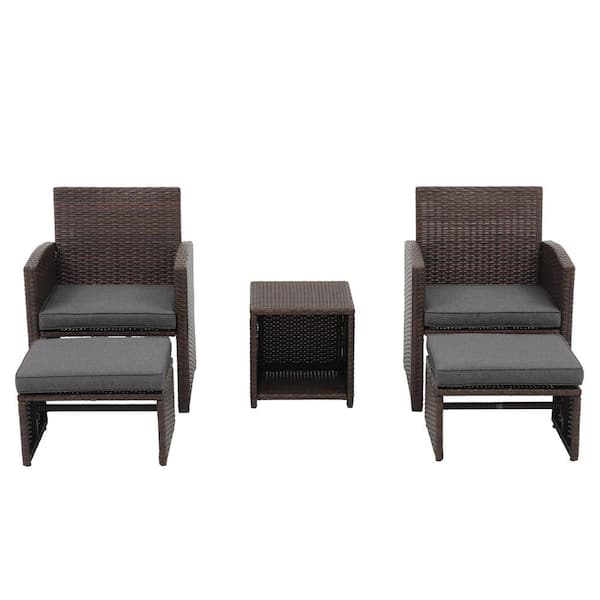 5-Piece Wicker Brown Outdoor Conversation Set with Ottomans and Side Table, Dark Grey Cushions