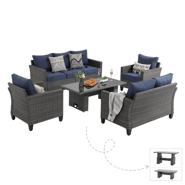 5-Piece Wicker Grey Outdoor Conversation Set with Lift Table, Navy Blue Cushions