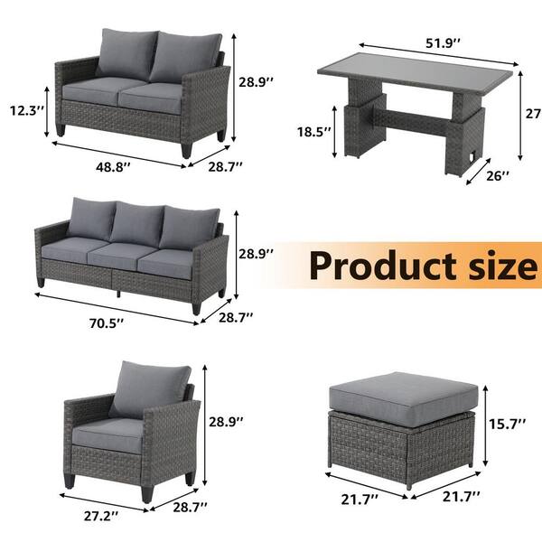 7-Piece Wicker Grey Outdoor Conversation Set with Lift Coffee Table and Ottomans, Grey Cushions