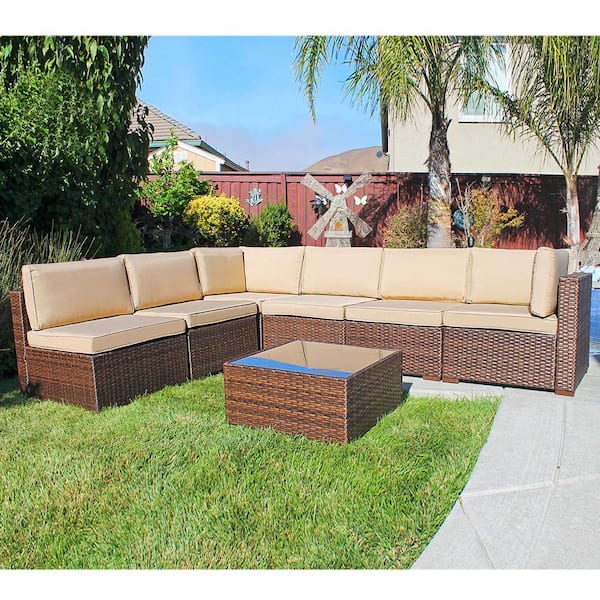 7-Piece Wicker Outdoor Sectional Set with Beige Cushions