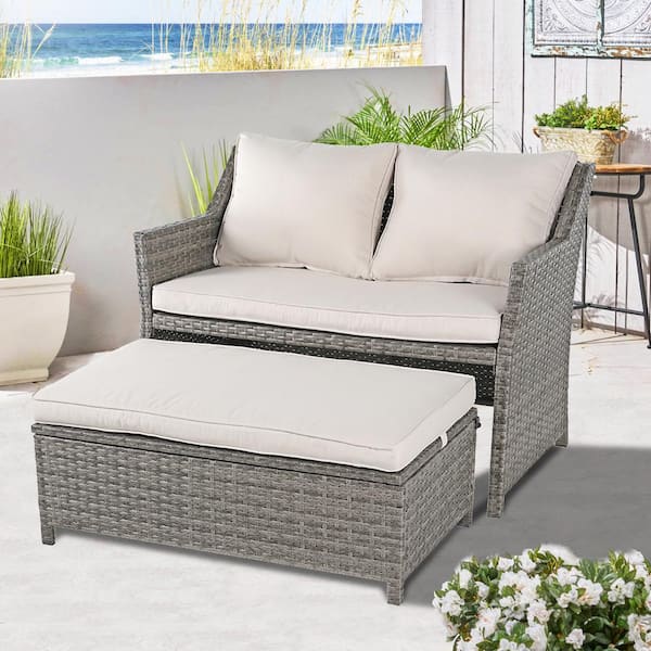 Gray 2-Piece Wicker Patio Conversation Sectional Set with Storage Ottoman, Beige Cushion