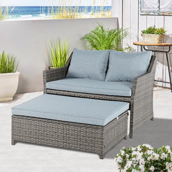 Grey 2-Piece Wicker Patio Conversation Sectional Set with Storage Ottoman, Grey Cushion