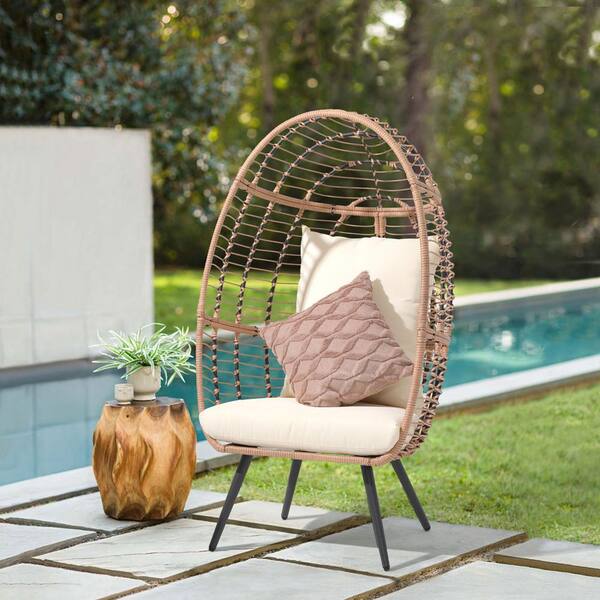 Wicker Beige Outdoor Indoor Egg-Shaped Lounge Chair with Removable Beige Cushion