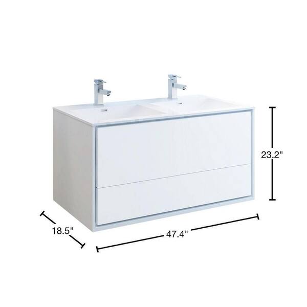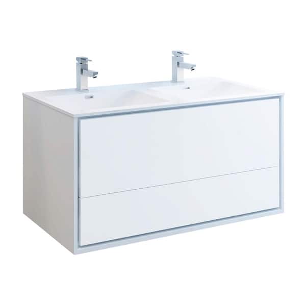 Catania 48 in. Modern Double Wall Hung Bath Vanity in Glossy White, Vanity Top in White with White Basins