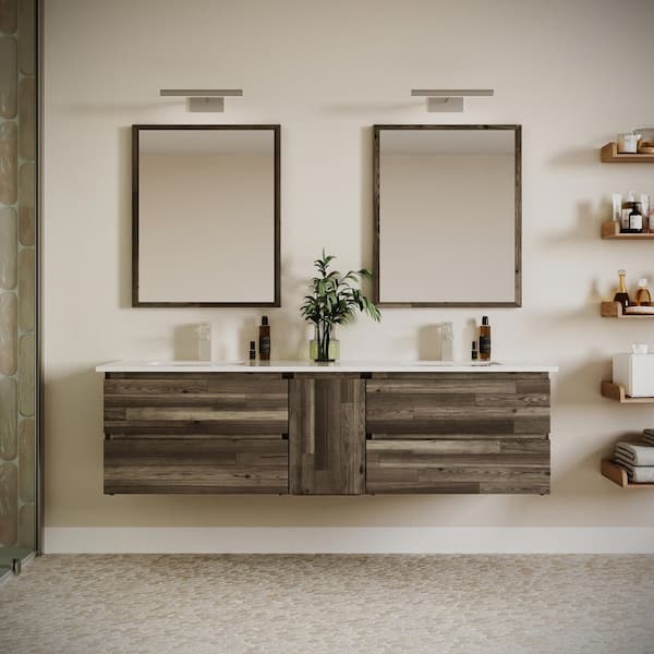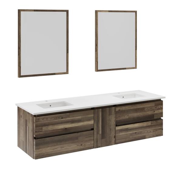 Formosa 72 in. Double Sink Wall Mount Floating Acacia Bath Vanity with White Quartz Top, Ceramic Sinks and Mirrors