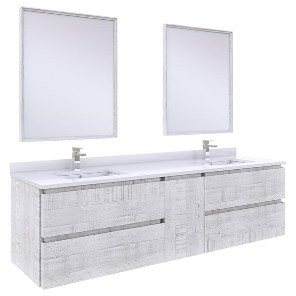 Formosa 72 in. Double Sink Wall Mount Floating Rustic White Bath Vanity with White Quartz Top, Ceramic Sinks and Mirrors