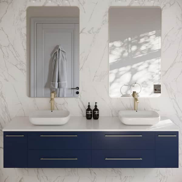 Lucera 72 in. Double Sink Wall Mount Floating Royal Blue Bath Vanity with White Quartz Top and Vessel Ceramic Sinks