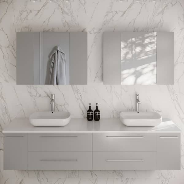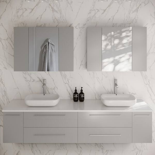 Lucera 72 in. Double Sink Wall Mount Gray Bath Vanity with White Quartz Top, Vessel Sinks and Medicine Cabinets