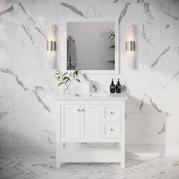 Manchester 36 in. Single Sink Shaker-Style White Bath Vanity with White Quartz Top, Integrated Sink and Mirror