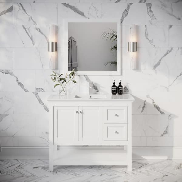 Manchester 42 in. Single Sink Shaker-Style White Bath Vanity with White Quartz Top, Integrated Sink and Mirror