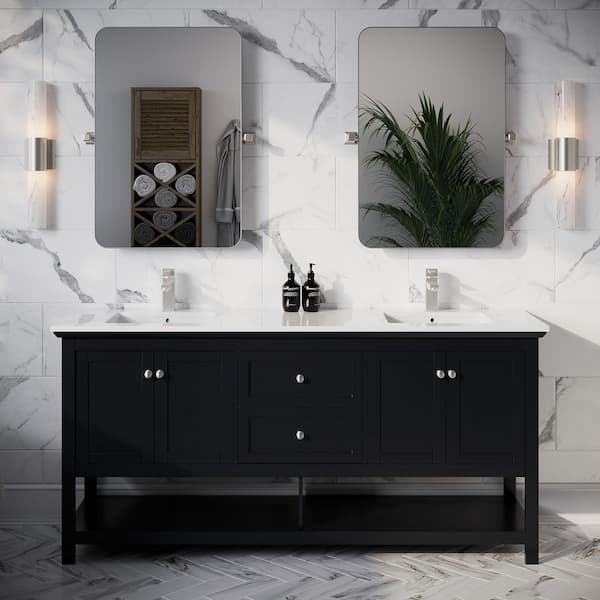 Manchester 72 in. Double Sink Shaker-Style Black Bath Vanity with White Quartz Top and Integrated Sink