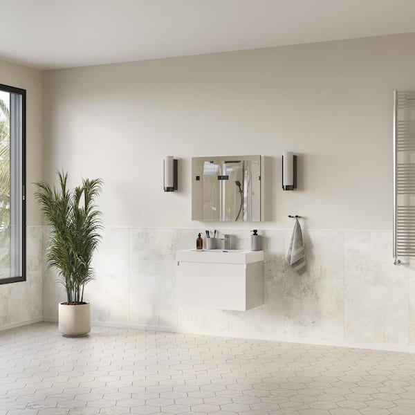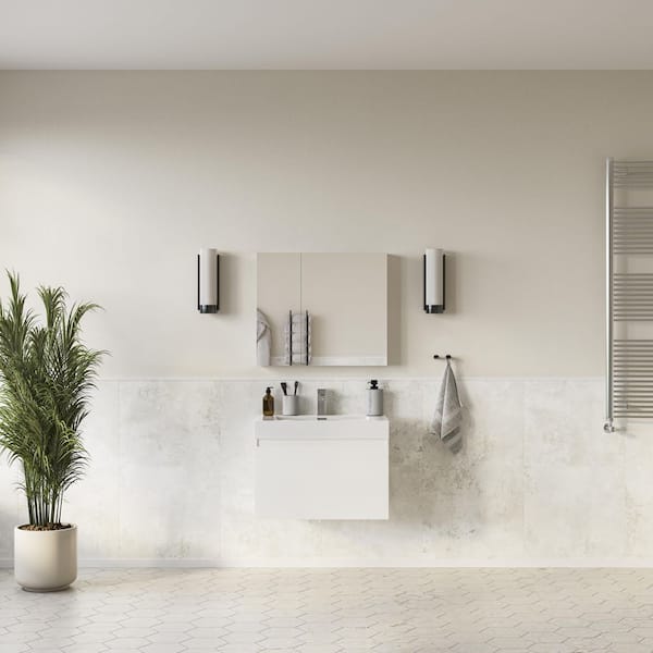 Mezzo 30 in. Vanity in White with Acrylic Vanity Top in White with White Basin and Mirrored Medicine Cabinet