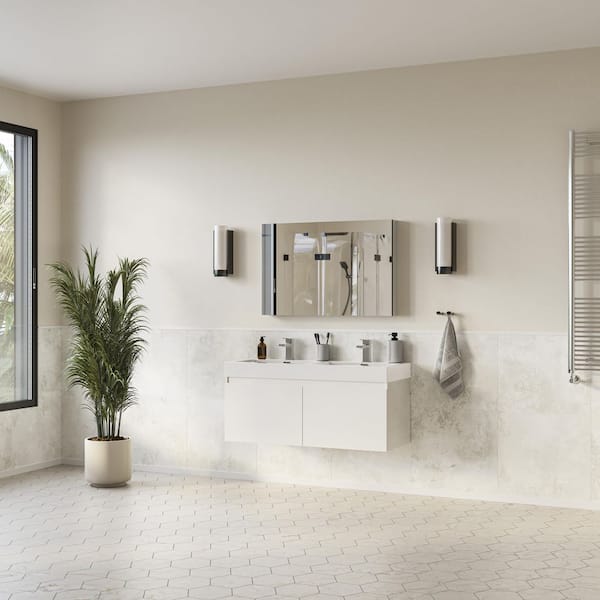 Mezzo 48 in. Vanity in White with Acrylic Vanity Top in White with White Basins and Mirrored Medicine Cabinet