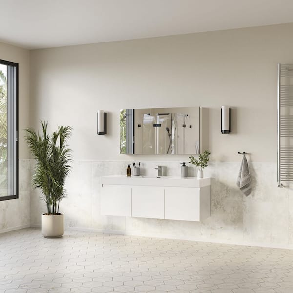 Mezzo 59 in. Vanity in White with Acrylic Vanity Top in White with White Basin and Mirrored Medicine Cabinet